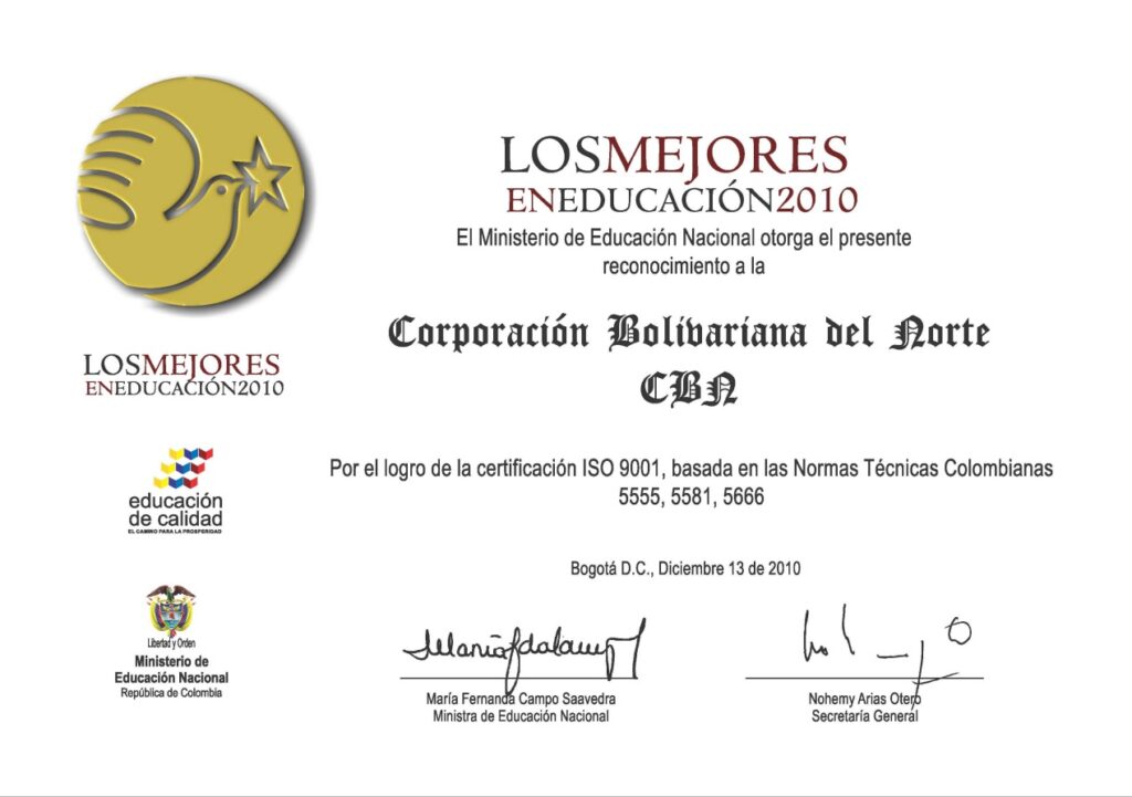 La política de calidad de la Corporación Bolivariana del Norte, institución de educación para el trabajo y el desarrollo humano, es prestar servicios educativos de alta calidad mediante el mejoramiento continuo de sus procesos, la articulación con la educación superior, el cumplimiento de los requisitos legales y la responsabilidad social, con personal competente, infraestructura adecuada, tecnologías y pedagogías actualizadas para satisfacer las necesidades y expectativas de nuestros clientes, garantizando la formación de personas con las competencias requeridas para el sector productivo.